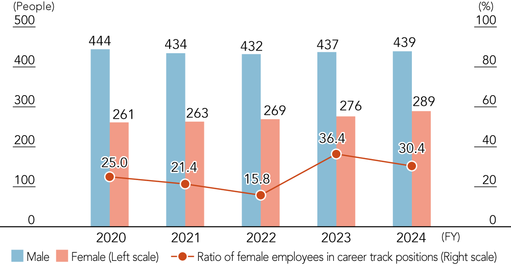 Our hiring of employees is based on Our Corporate Spirit of integrity, fairness, and harmony, a belief that has been nurtured since our founding 180 years ago. We are committed to hiring people who can actively practice the 3Cs: “Change (Change ourselves as society changes); Challenge (Challenge new fields with conviction and ambitious spirit); and Create (Create fresh global value through diversity).” In recent years, we have strengthened our human resource portfolio, for example by hiring more mid-career recruits, with the aim of capturing talent with the diverse experiences and skills that we need to expand the business areas of the group. “Diversity and inclusion” is a material issue for the group, and one of our initiatives under this theme is for Japan Pulp & Paper Co., Ltd. to raise its percentage of female managers to 10% or more by fiscal 2030. To achieve this target, in OVOL Mediumterm Business Plan 2026, we have set a goal of increasing the ratio of female employees in career-track positions to 30% or more. (We achieved this target in fiscal 2024.) Going forward, we will proactively leverage diverse recruitment channels, including headhunting and rehiring former employees, in order to further enhance our human resource recruitment.
