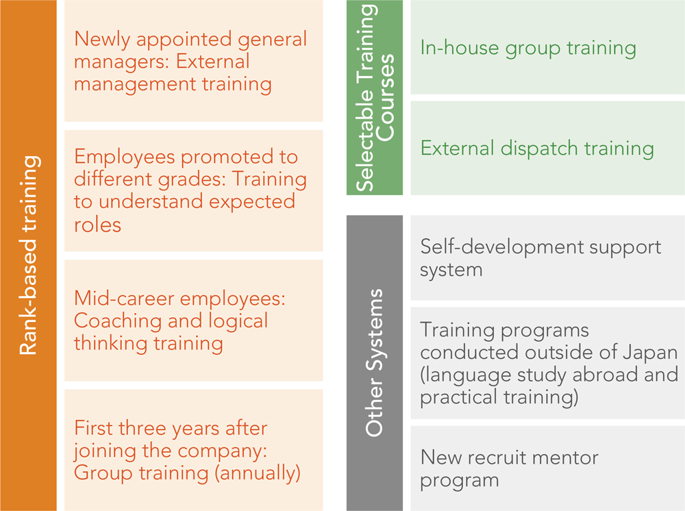 The group is active in five business segments: Japan Wholesaling, Non-Japan Wholesaling, Paper Manufacturing & Processing, Raw Materials & Environment, and Real Estate Leasing. As we seek to expand our business areas going forward, the development of human resources with diverse experiences and skills has become an urgent task. To do this, OVOL Medium-term Business Plan 2026 has set out the goals of raising the skill level of employees and enhancing training to develop human resources with expertise. For example, we actively use business schools as a part of our selectable training courses, with the aim of developing manager-level human resources. We have also introduced an international training program to develop global talent with an international perspective that is capable of practical communication with counterparts from around the world. Another initiative is to proactively second our employees to group companies, business partners, and external organizations that are important to our business strategies, thereby enabling them to acquire a wide range of knowledge and strengthen their specialist skills through practical experience based on the group’s business strategies. Going forward, we will strengthen our human resource development by further enhancing our lineup of open-application training courses that are useful for advancing the group’s business strategies, while also making proactive use of the Udemy Business online training service that we adopted the previous fiscal year.