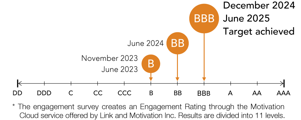 In the engagement surveys conducted in December 2024 and June 2025, we achieved a BBB score, meeting our target in the Medium-term Business Plan two years ahead of schedule. Challenges identified through engagement surveys include the lack of communication with employees about the group’s growth strategy and the development of human resources through personnel rotation. As a part of our initiatives to promote communication about the group’s growth strategy, we held seminars for general managers, branch managers, and division managers in order to strengthen the “coordination function” between management and employees on the ground. We also held “dialogue meetings” between the president and division managers, and meetings between branch employees and management as forums for senior management to share and communicate with the rest of the company.