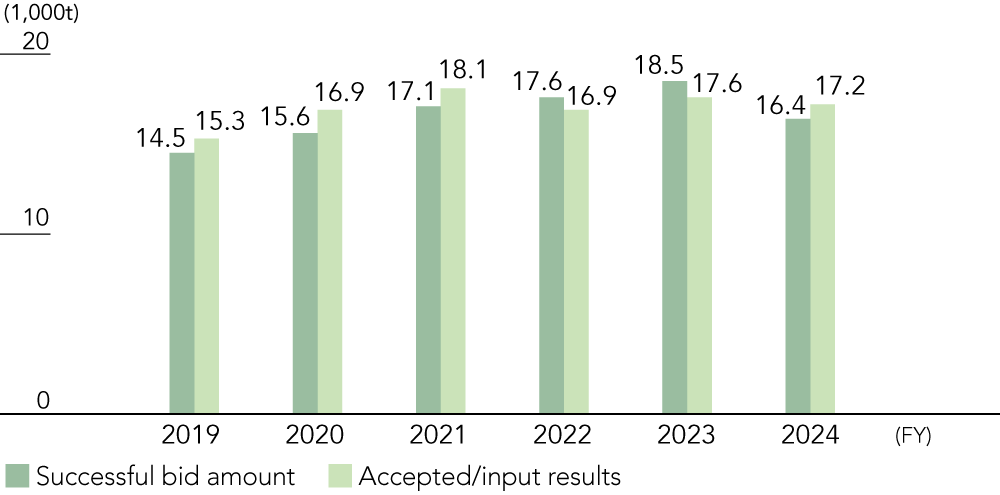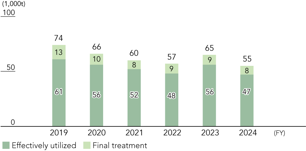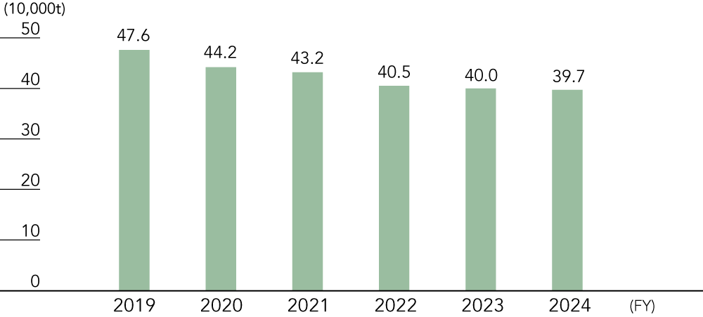 “Efficient and reduced use of resources” is part of our Environmental Policy, and we designated “resource recycling” as a material issue. We are contributing to the creation of a resource-recycling society by working to reduce waste and protect forest resources, including through the wastepaper recycling business, the paper manufacturing business that uses wastepaper as a raw material, and the waste plastic recycling business.