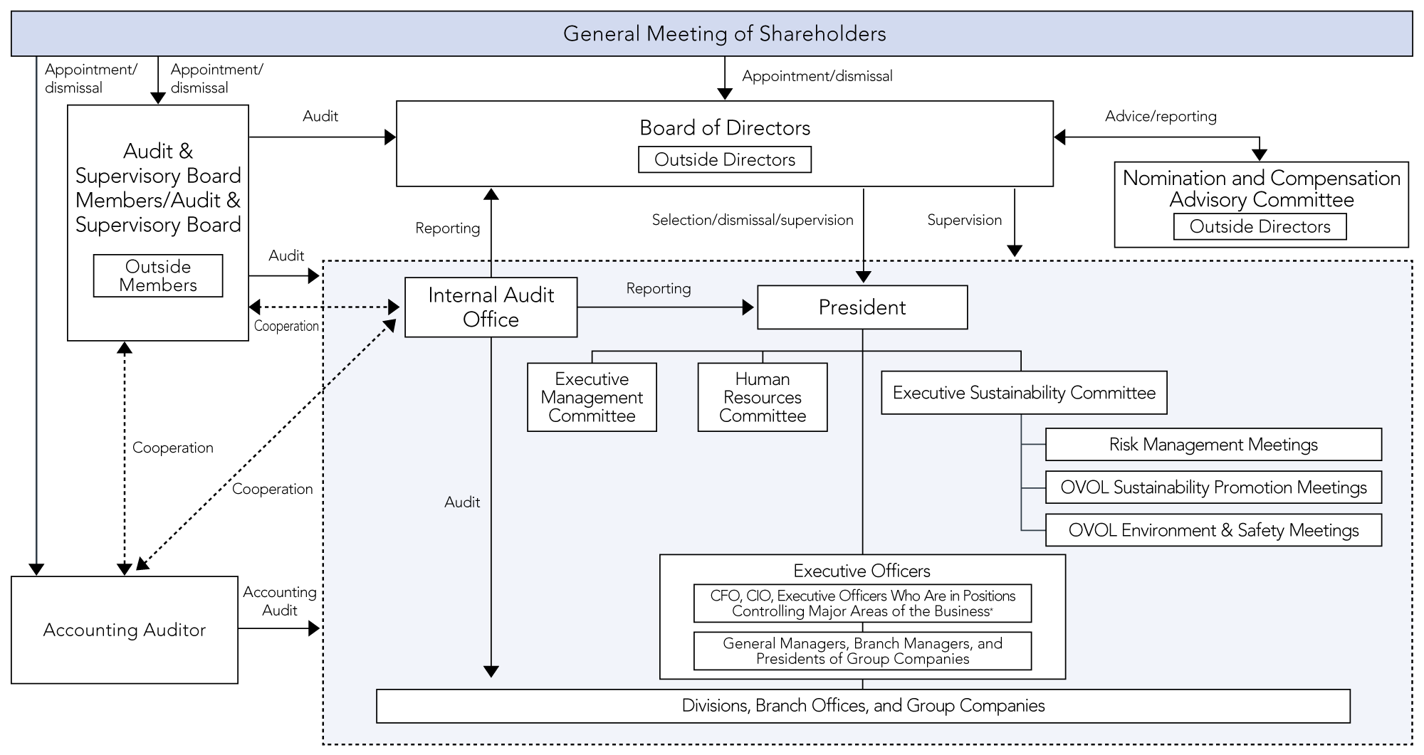 Based on committee rules, the Executive Sustainability Committee meets regularly once a quarter and whenever necessary. The committee is in charge of formulating sustainability-related policies and strategies, resolving ESG-related issues, and managing the achievement of the group’s goals. It serves as the command center for group-wide sustainability initiatives. Progress and action plans are reported regularly to the Board of Directors, and specific initiatives are entrusted to subordinate organizations, such as the Risk Management Meetings, the OVOL Sustainability Promotion Meetings, and the OVOL Environment & Safety Meetings.