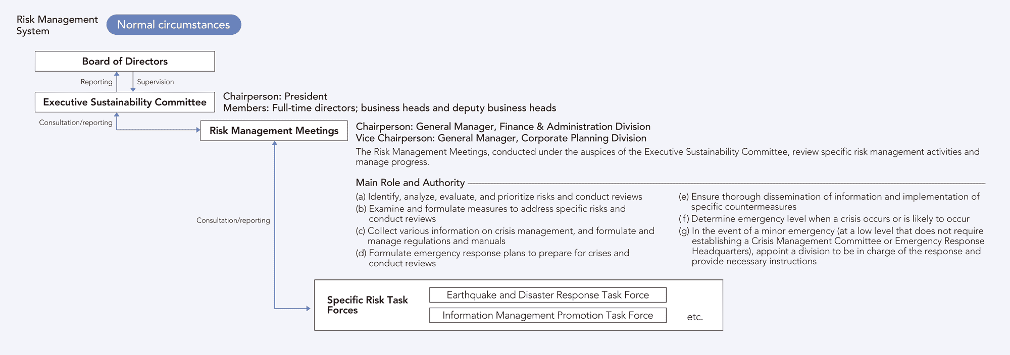 Members of the Executive Sustainability Committee discuss and approve annual activity plans related to risk management and confirm the progress of these plans on a quarterly basis. The committee also reports to the Board of Directors, which supervises these activities. The Risk Management Meetings, under the auspices of the Executive Sustainability Committee, are chaired by the general manager of the Finance & Administration Division, and members identify, analyze, evaluate, and prioritize risks as well as formulate measures to address specific risks.