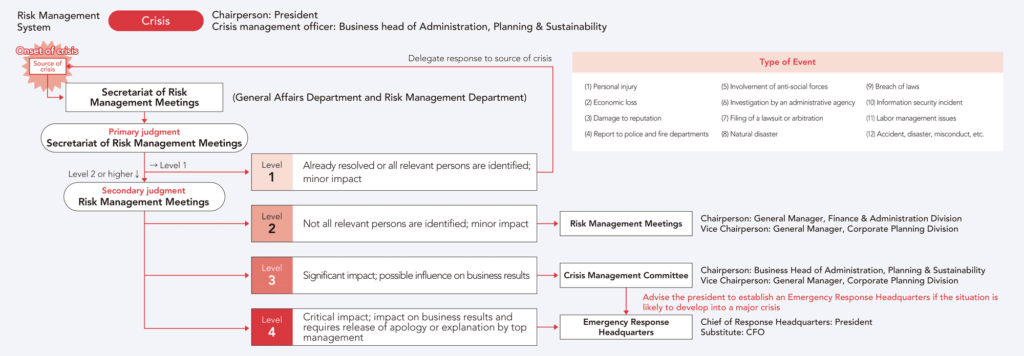 In the event that a risk with a significant negative impact on the group’s management or business materializes, a Crisis Management Committee, with ultimate responsibility held by the president and chaired by the business head of Administration, Planning & Sustainability, will be established. The committee will be tasked with rapidly and appropriately dealing with the emergency situation, minimizing or preventing damage, restoring normalcy, and putting countermeasures in place.