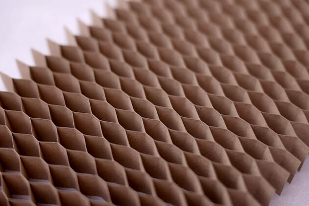 ハニカム構造の紙といえば、七夕やお祭りの飾りでなじみのある、カラフルな紙でつくられた小物が思い浮かぶ。しかし、強度のある段ボール原紙などでつくられたハニカムペーパーが、軽くて丈夫なことから、建材の補強材などとして用いられているのはご存じだろうか。