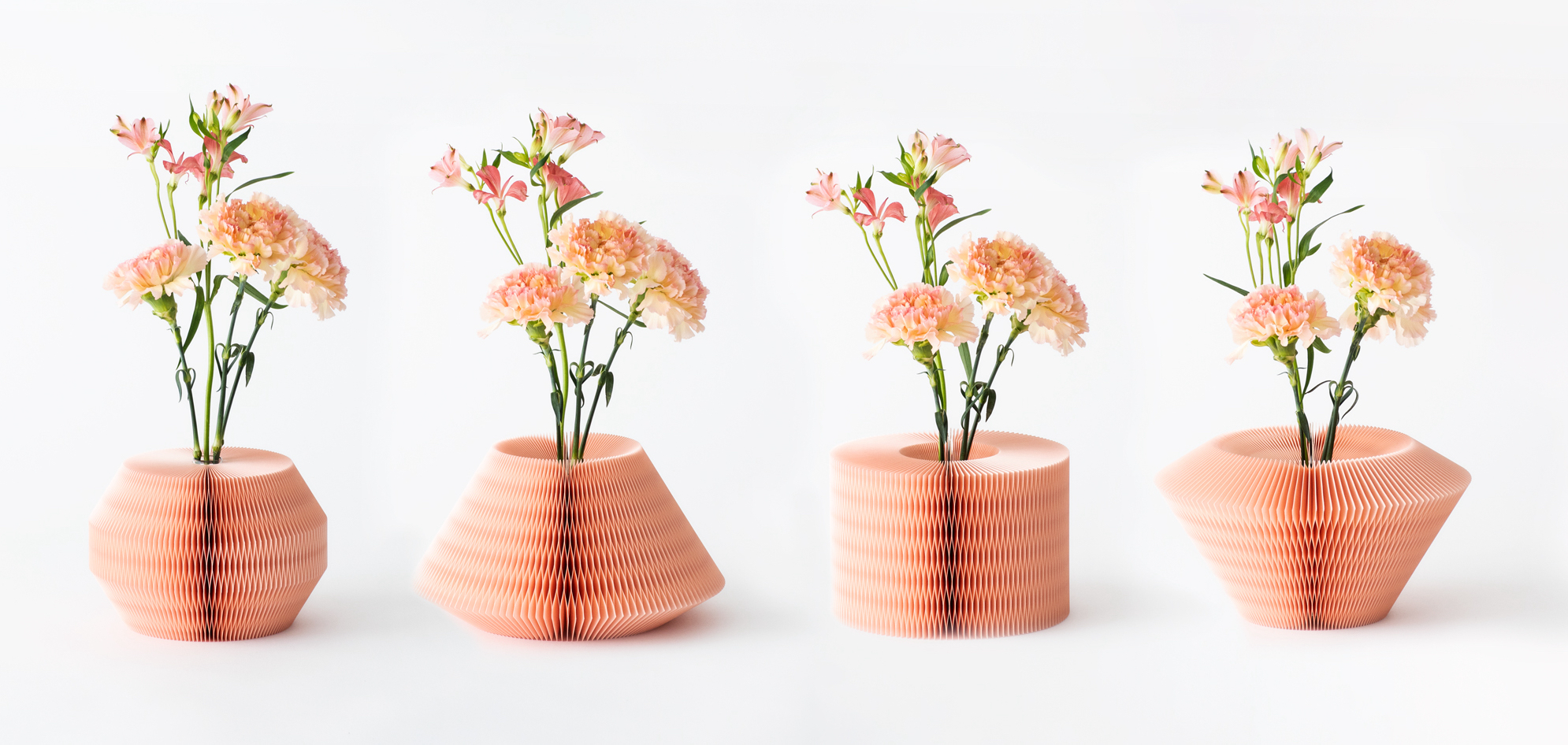 ハチの巣のような立体構造を指す「ハニカム構造」は紙の世界にも存在する。そのハニカム構造を用いて、紙の重なりがつくり出す陰影と、ふんわりと開いた形状が美しい花器がデザインされた。手軽に取り入れることができ、暮らしを美しく彩る紙の花器の、知られざる開発ストーリーに迫った。