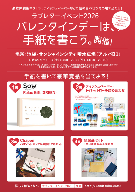 日本製紙連合会は、「片思いの相手」「恋人・夫婦」「家族」「友達」など、大切な思いを伝えたい相手に向けたラブレターを来場者に綴っていただく、ラブレター執筆体験イベント「ラブレターイベント2026 バレンタインデーは、手紙を書こう。」を、池袋・サンシャインシティ 噴水広場(アルパ B1)にて2月7日(土)~14日(土)まで開催します。