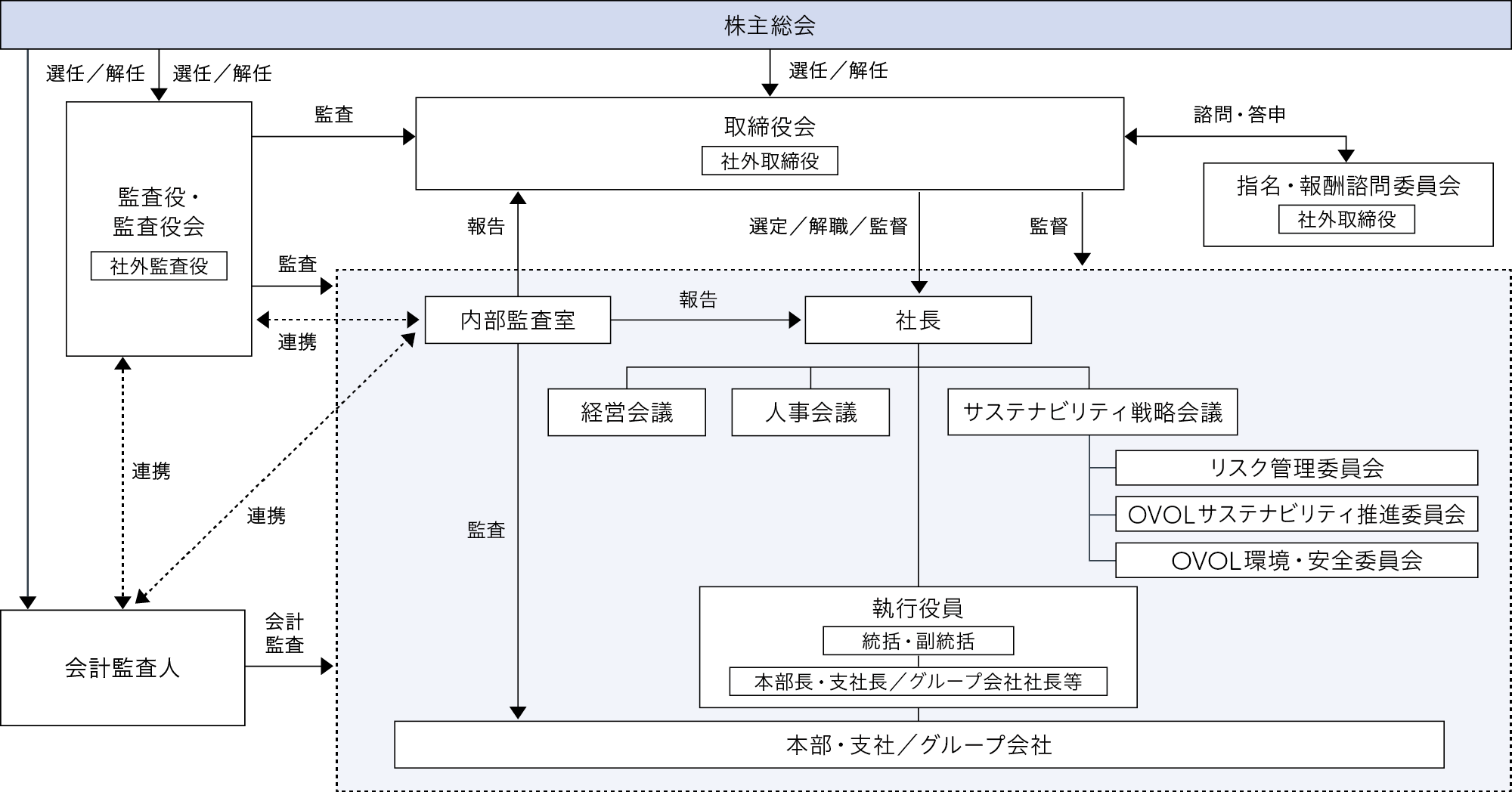 活動計画および進捗状況は定期的に取締役会へ報告されており、各課題への具体的な取り組みは、下部組織である「リスク管理委員会」「OVOLサステナビリティ推進委員会」「OVOL環境・安全委員会」に委ねられています。