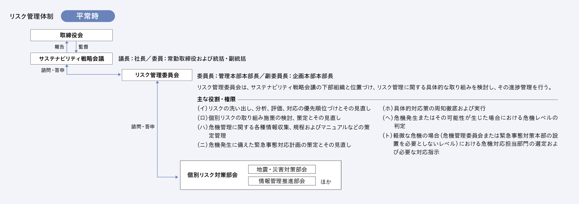 当社は、サステナビリティ戦略会議において、リスク管理に関わる年間活動計画を議論、承認するとともに、四半期ごとにその進捗を確認し、取締役会に報告、取締役会はこれを監督しています。